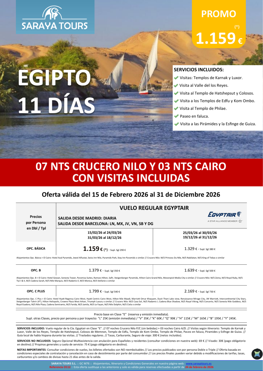 Egipto 11 días. Salidas Mad y Bcn *Crucero 7 noches y Cairo con Visitas Incluidas* dsd 1159€ hasta Dic26
